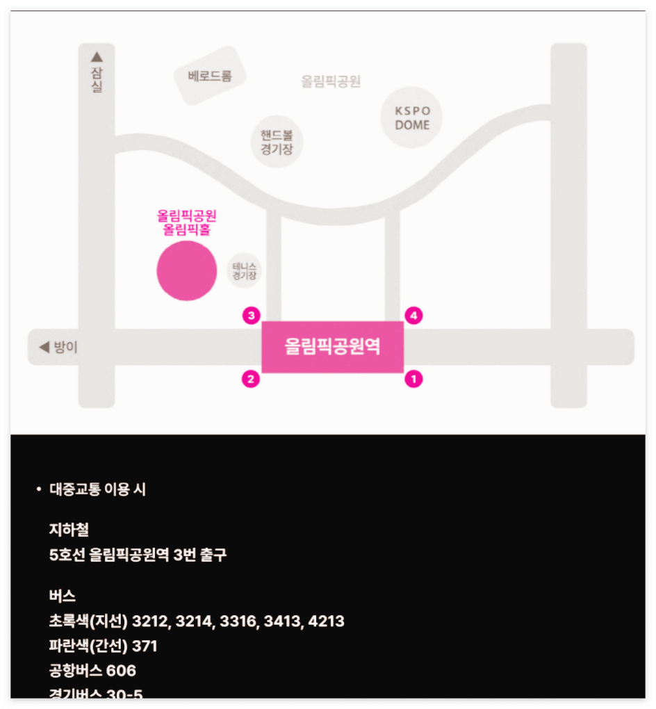 주소: 서울특별시 송파구 올림픽로 424 올림픽공원 내 올림픽홀