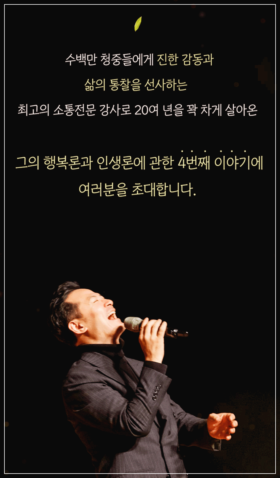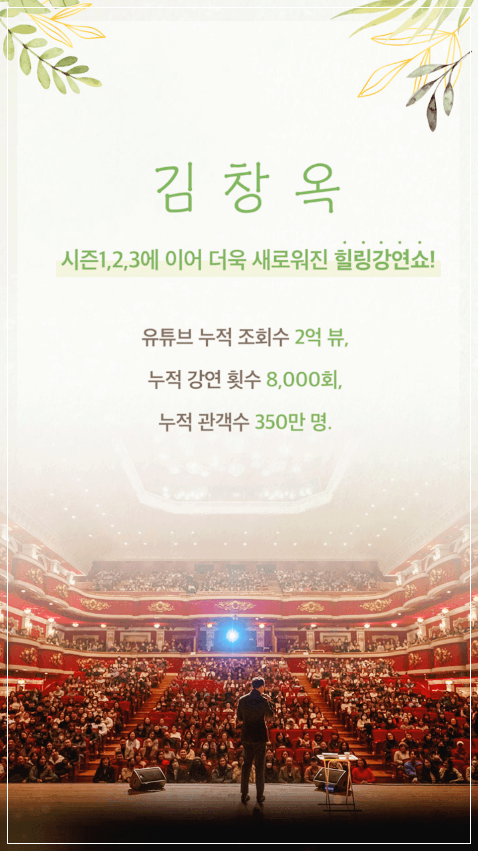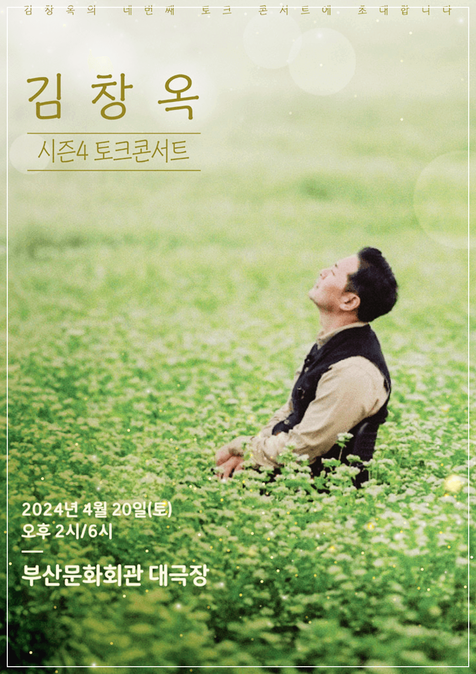 2024 김창옥 토크콘서트 시즌4가 2024년 4월 20일 부산문화회관 대극장에서 시작될 예정입니다. 유튜브 누적 조회수 2억뷰, 누적 강연 횟수 8,000회, 누적 관객수 350만 명의 관객들에게 수많은 감동을 주고 있고 김창옥의 행복론과 인생론에 관한 4번째 이야기보따리가 부산에서 펼쳐집니다.