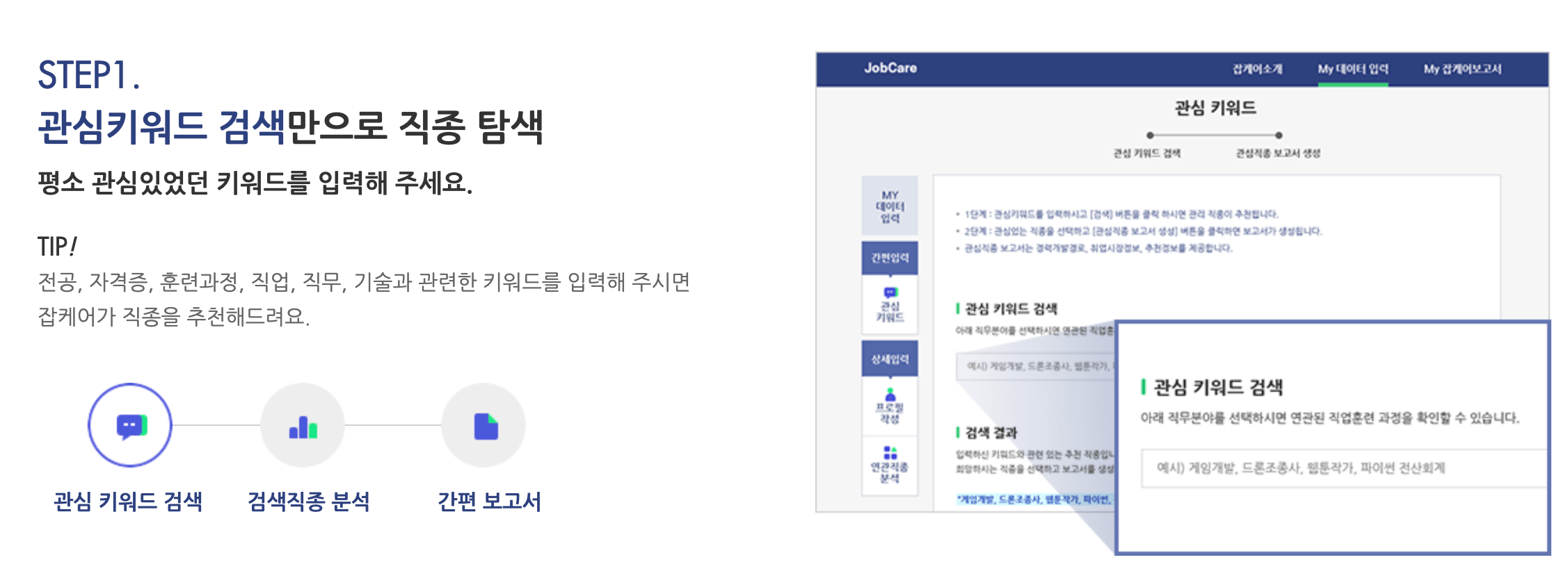 관심 키워드를 입력하여 나에게 맞는 직종을 분석하는 간편 입력은 전공, 자격증, 훈련과정, 직업, 직무, 기술만 입력하면 간편하게 조회가 가능합니다.