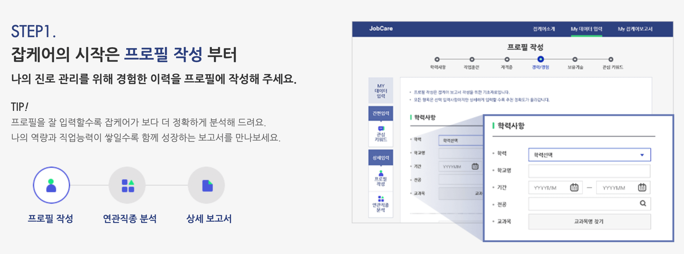 프로필작성부터 시작하는 상세입력은 경험해 왔던 이력 및 학력까지 선택이 가능하여 더욱더 상세한 연관직종 분석이 가능합니다.