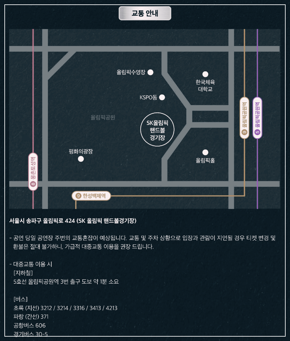 지하철: 9호선 5호선 올림픽공원역 하차 후 바로 앞