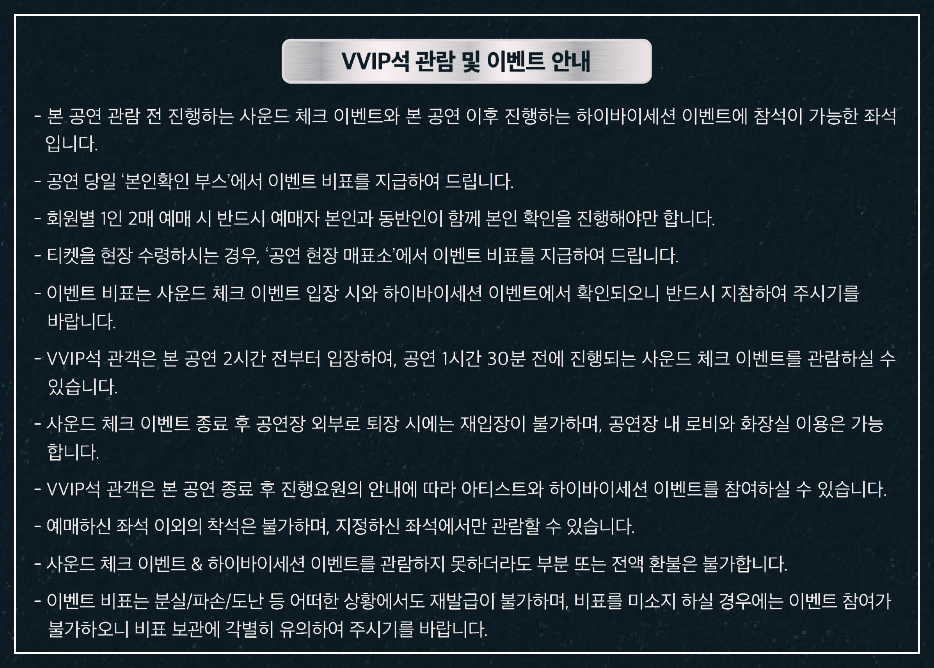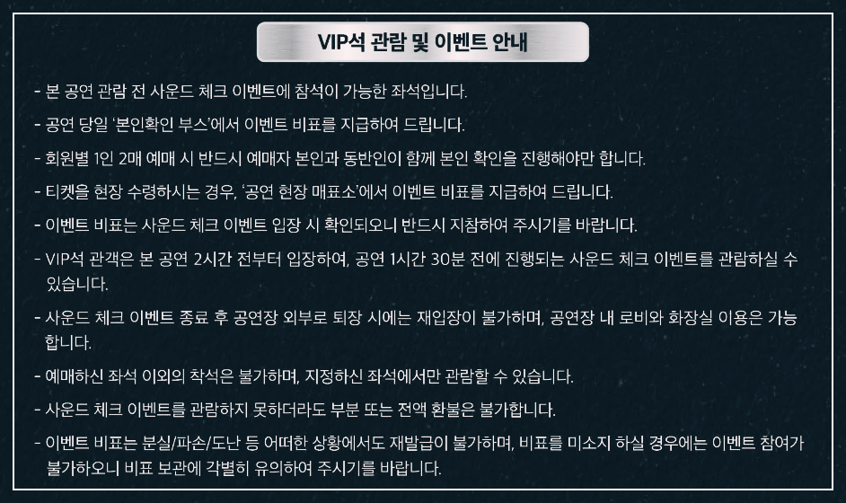 좌석 구역은 3구역으로나눠지며 VVIP석과 VIP석에는 이벤트도 준비되어있으니 위 링크를 통해 확인가능합니다. 할인은 인터파크티켓 단독상품으로 NOL할인만 가능하니 참고하시기 바랍니다.